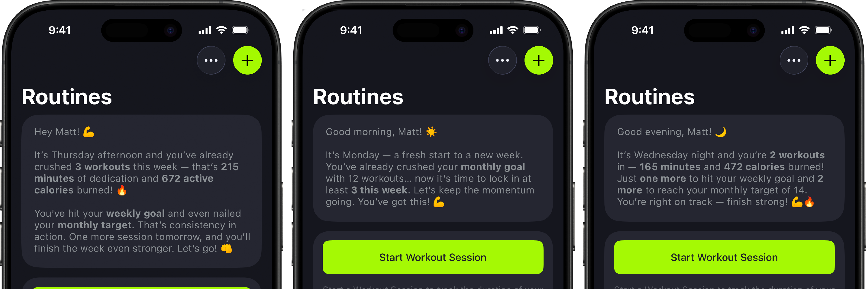 On the main screen (Routines tab), you’ll be welcomed with a personalized motivational message at the top, generated from your fitness data and goals. This is a smart dynamic greeting, that constantly changes to reflect your progress. They appear right above your routines and it is a great motivation boost.