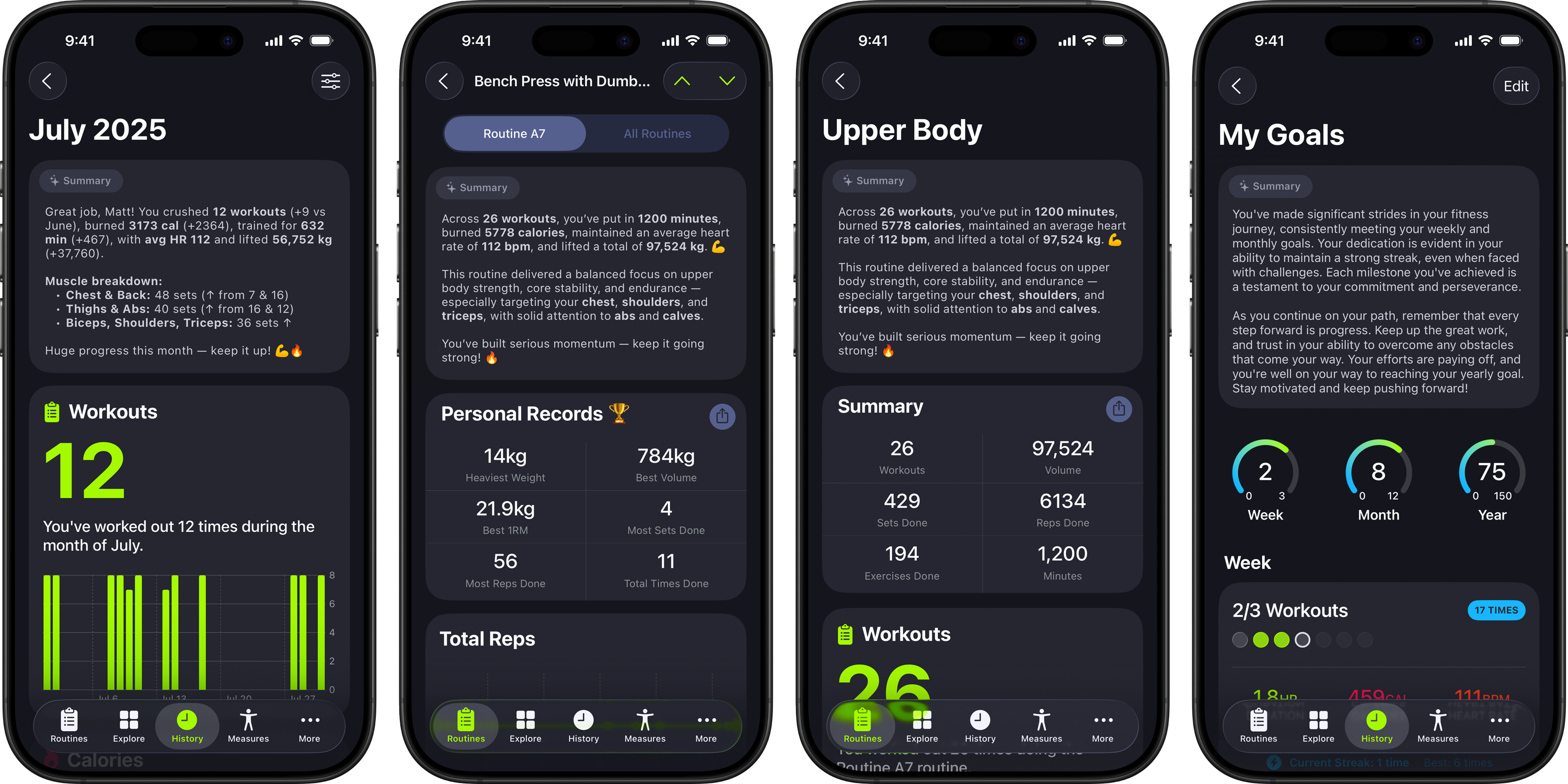 Tracking progress just got smarter. SmartGym now uses Apple Intelligence to turn your workout data into short, insightful summaries. Monthly summaries, routine breakdowns, and your custom goals, all made easy to understand.