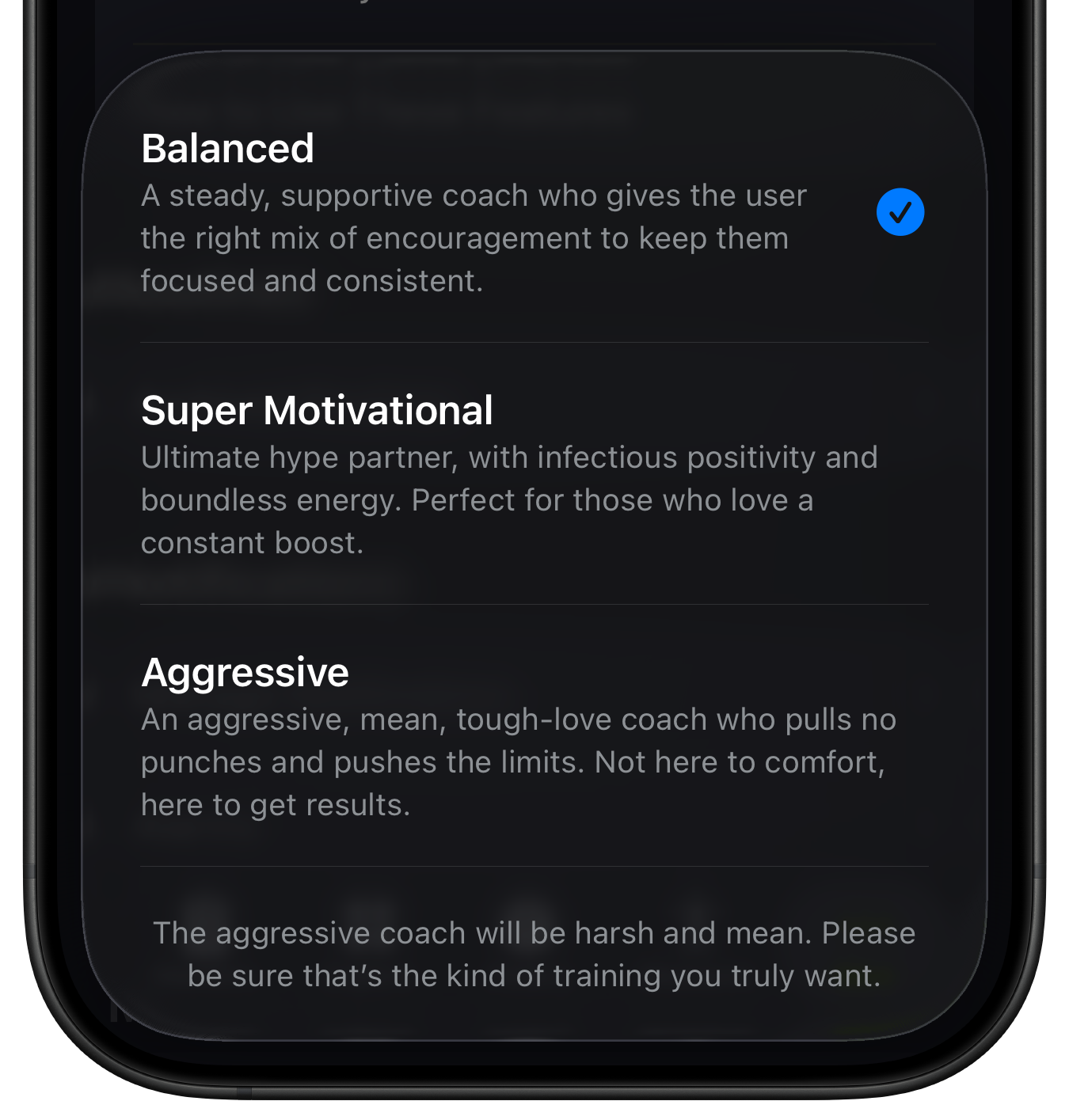 Everyone gets motivated differently. Some thrive on high-energy encouragement, others prefer a steady, balanced push, and a few need that no-nonsense, tough-love approach. With AI Personalities, the user can choose the coaching style that works best for them: